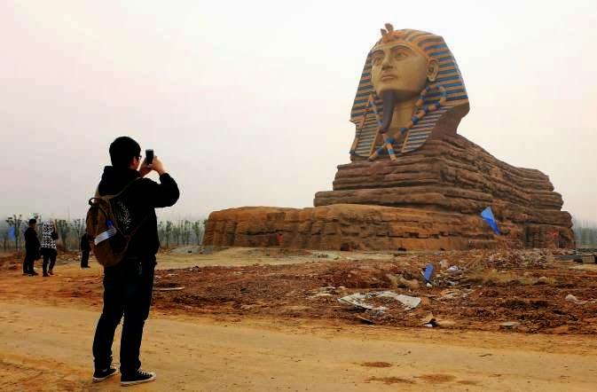 A man photographing a replica sphinx, which became part of the garden tour and animated films in Chuzhou, ChinaA farmer was hoeing in the ground near the Eiffel Tower replica at Tianducheng region, Hangzhou, China